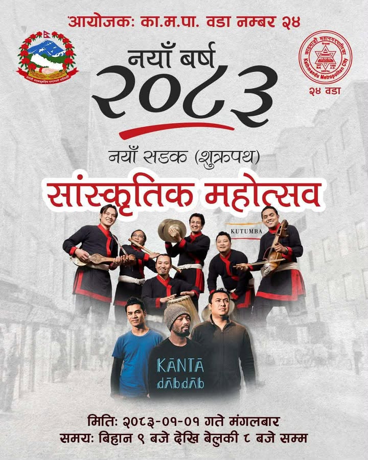 काठमाडौं । नयाँ वर्ष २०८३ को अवसर पारेर काठमाडौं महानगरपालिका वडा नं.–२४ को आयोजनामा नयाँ सडक क्षेत्रमा विशेष सांस्कृतिक महोत्सव आयोजना गरिने भएको छ ।