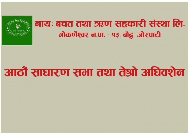 काठमाडौं । नायः बचत तथा ऋण सहकारी संस्था लि. बौद्ध–जोरपाटीको पुष १४ गते शनिवार आठौं साधारण सभा तथा तेश्रो अधिवेशन हुने भएको छ ।