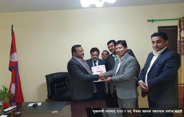 सम्झौता पत्रमा प्रदेश सरकारको तर्फ बाट मुख्यमन्त्री तथा मन्त्री परिषद कार्यालयका सचिव हरिप्रसाद फुयाल र प्रभु बैकका तर्फ बाट सहायक महाप्रवन्धक अशोक खडगीले हस्ताक्षर गरेका छन् ।