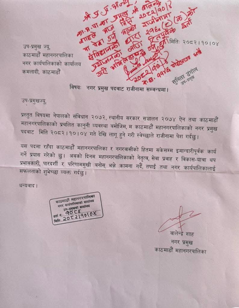 काठमाडौं । काठमाडौं महानगरपालिकाका मेयर बालेन शाहले पदबाट राजीनामा दिएका छन ।
