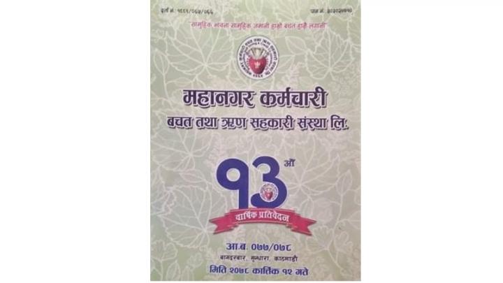काठमाडौं । महानगर कर्मचारी वचत तथा ऋण सहकारी संस्था लि. को यस वर्ष सम्पन्न तेह्रौं वार्षिक साधारण सभाले संस्थाका अध्यक्ष महेश कुमार काफ्लेद्वारा प्रस्तुत संस्थाको आ.व. २०७७/०७८ को वार्षिक प्रतिवेदन, लेखापरीक्षकको प्रतिवेदन, आ.व. २०७७/७८ को वित्तिय विवरण, लेखा समितिको प्रतिवेदन, आ.व. २०७७/०७८ को पल्र्स प्रतिवेदन, आ.व. २०७७/०७८ को वार्षिक प्रगती प्रतिवेदन तथा आ.व. २०७८÷०७९ को कार्यक्रम बजेट सम्बन्ध, लेखापरीक्षक नियुक्ती, लाभांश वितरण सम्बन्ध, साधारण सभाको निर्णय पुस्तिकामा हस्ताक्षर सम्बन्ध लगायत विषय उपर छलफल गरी आगामी आ.व. को लागी पारित गरेको छ ।