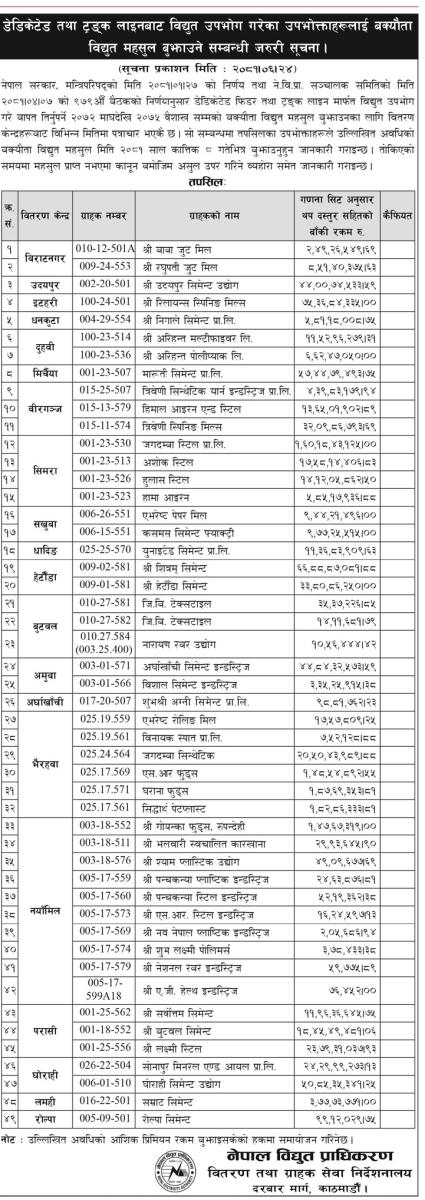 यी ४९ उद्योगलाई प्राधिकरणले बक्यौता रकम तिर्न जारी गरे सुचना