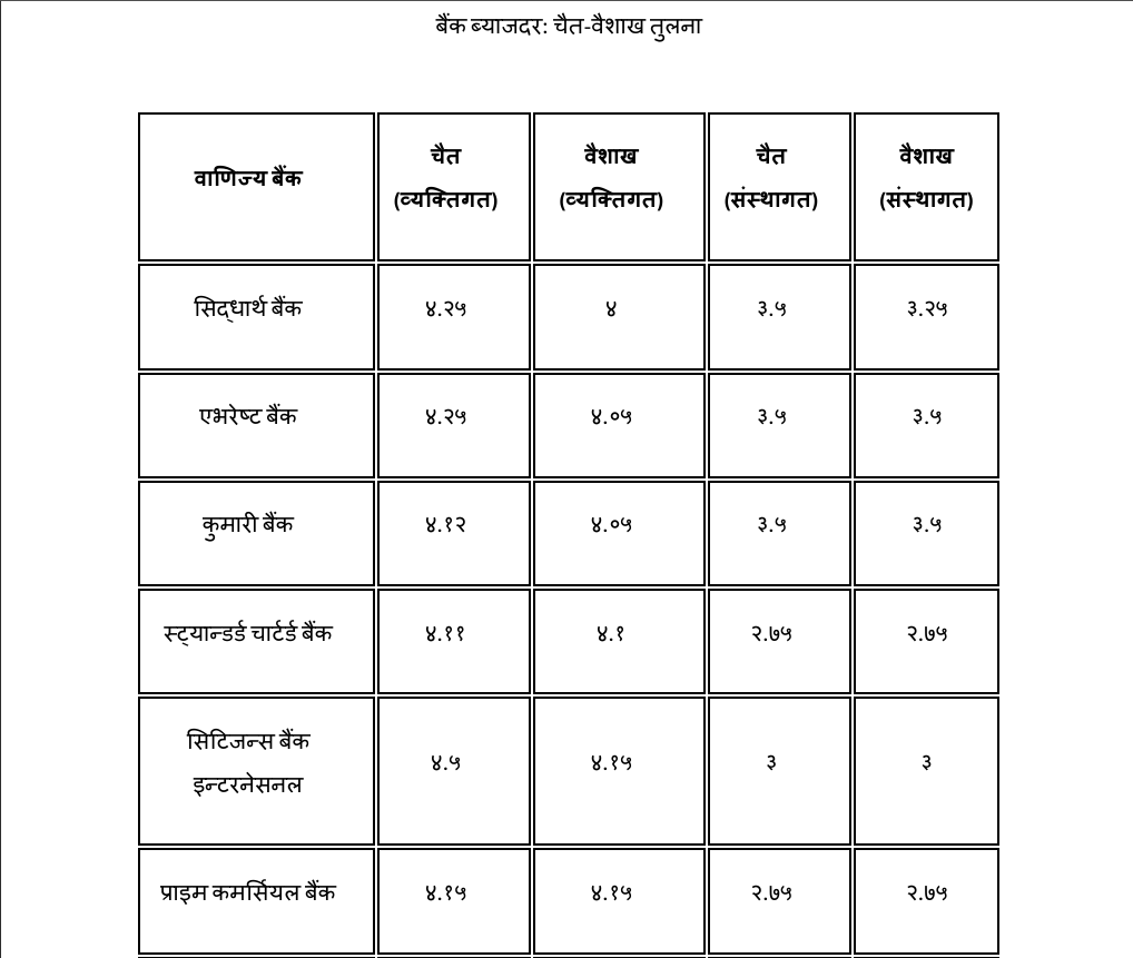 यस्तै, व्यक्तिगत मुद्दती निक्षेपमा अधिकतम ५ प्रतिशत ब्याजदर दिने बैंकका रूपमा एनएमबि बैंक रहेको छ भने अन्य वाणिज्य बैंकहरूले ब्याजदर स्थिर राखेका छन ।