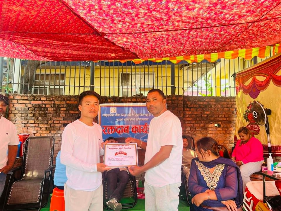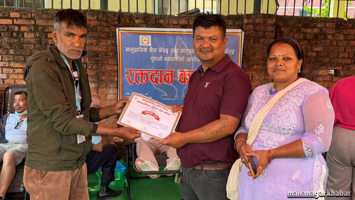 कार्यक्रममा रक्तदाताहरुलाई समुदायिक सेवा केन्द्रका अध्यक्ष कमरुद्धिन मियाँ, प्रहरी नायव परीक्षक घिमिरे लगायतले प्रमायापत्र वितरण गरेका थिए ।